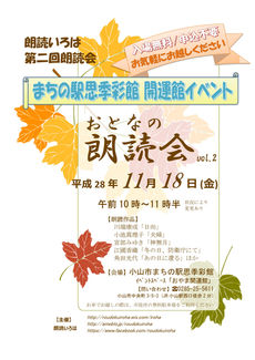 そこで、もっと気軽にお越しいただける入場無料の大人向けの朗読会を開催する「朗読いろは」を立ち上げました。(2015年11月)